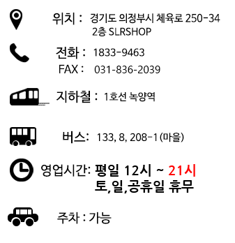 호루스벤누는 온라인 총판점 SLRSHOP에 서비스지정점(직영A/S센터)을 운영하고 있습니다. 서비스지정점 내방시 A/S 접수가 가능하며, 지방 고객님 등 내방이 어려울 경우 택배를 통한 접수가 가능합니다. 내방 및 A/S 접수시에는 반드시 전화문의 후 접수해 주시기 바랍니다.